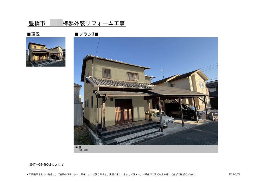 | 使用商材・建材 | 外壁 : ジョリパットフレッシュインフィニティ(1液型水性/装飾仕上げ塗材改修用高耐候性塗料/アイカ工業) 付帯 : 4Fイージスガード(2液型弱溶剤/無機配合型4フッ化フッ素塗料/CPJ・~クリスタルペイントジャパン~) 目地&開口部 : SRシールH100(超耐久・高耐候シーリング材/サンライズ) 仕上げ : クリスタルシーズンtg(可視光応答型ハイブリッド光触媒プロテクトコーティング) |